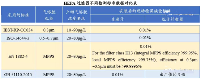 不同標準方法規(guī)定的掃描泄漏率基本都是≤0.01%,但實際上它們之間的完整性是存在明顯差異的。只有用EN1822標準檢測的過濾器才能夠標識為H××或者U××,IEST-RPCC034標準有自己A、B、C……劃分等級的指標。