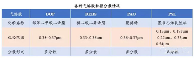 在高效過濾器安裝后的現(xiàn)場檢測,實際上是不可能使用MPPS方法的,只能夠使用粒徑比較接近MPPS粒徑的氣溶膠來檢漏。而且對于多分散的氣溶膠,還要注意它使用的是幾何平均粒徑還是質(zhì)量平均粒徑。目前比較常用氣溶膠和其粒徑的范圍如下表所示。