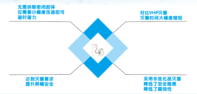 由于采用獨有的霧化效果,同時采用純過氧化氫作為滅菌介質(zhì),該方案的整體滅菌時間非常短,僅僅只有普通凍干機,隔離器的二分之一到五分之一時長。
